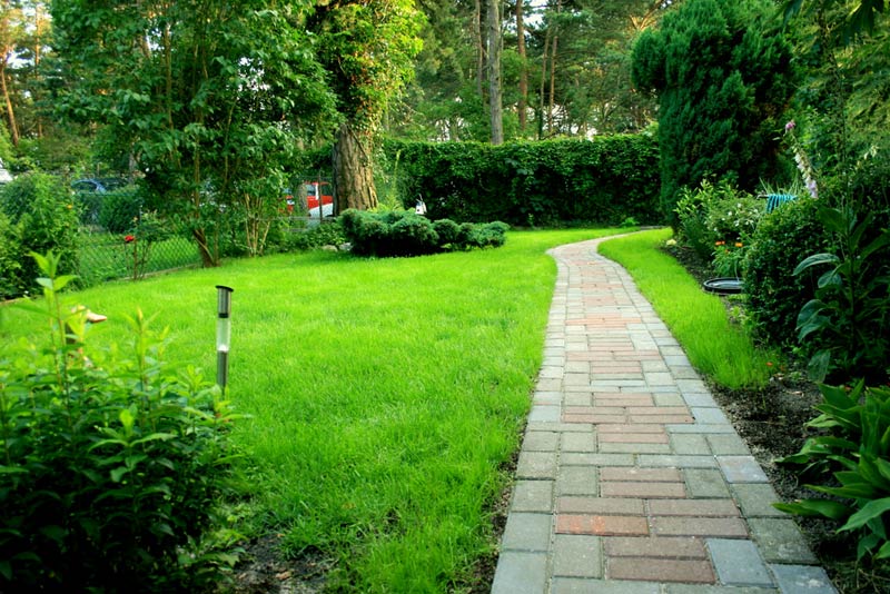 - zielony ogród z trampoliną do skakania dla dzieci